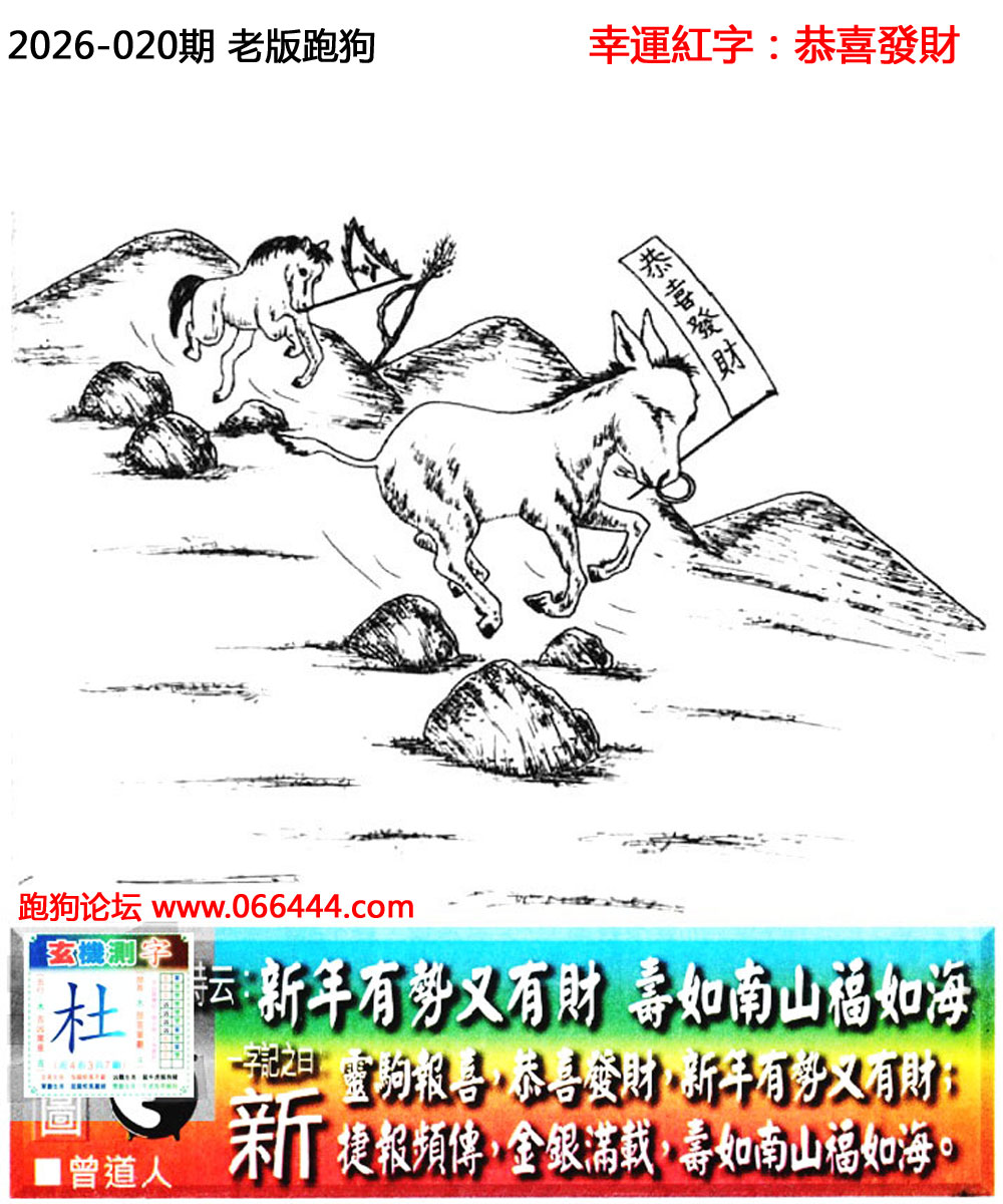 020期老版跑狗一字記之曰:【新】 新年有勢又有財,壽如南山福如海。 靈駒報喜,恭喜發財,新年有勢又有財; 捷報頻傳,金銀滿載,壽如南山福如海。 玄機測字:《杜》